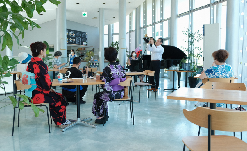 ア・トリエカフェにて音楽を聴きながらコーヒーを楽しむ